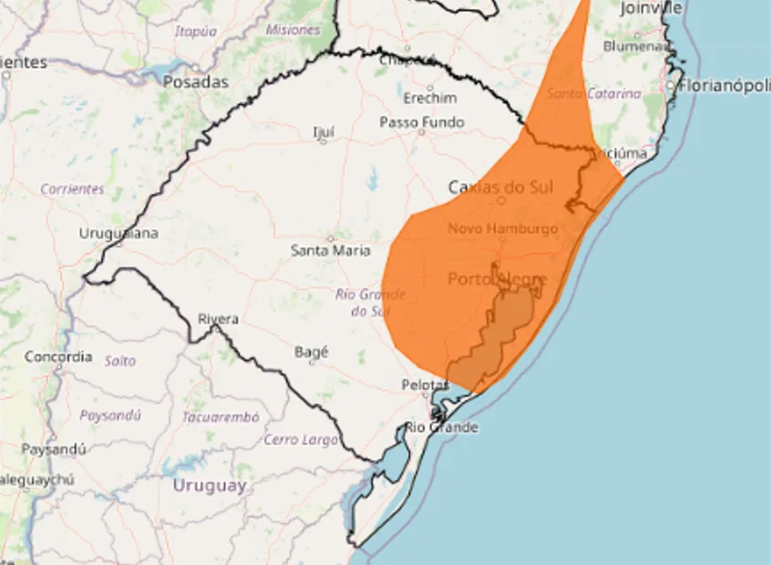 O alerta compreende uma parte mais ao leste do território gaúcho. Deve chover na Costa Doce, na Região Metropolitana, Vales, Região Central, Serra e Litoral Norte (Confira no mapa abaixo).