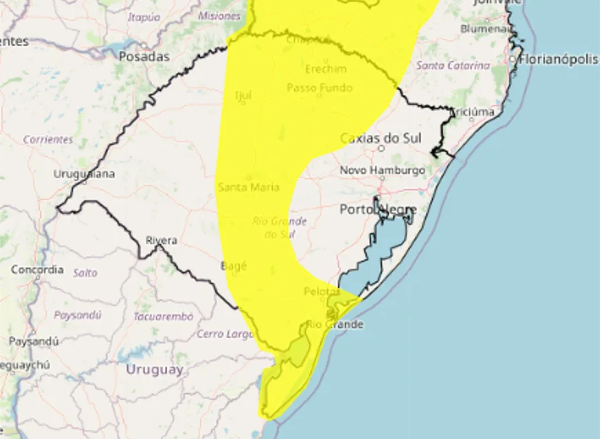Além disso, há um alerta amarelo para outras regiões, válido também até a manhã de segunda-feira (19). Deve chover, no Sul, Campanha, Região Central, Norte e Noroeste (Confira no mapa abaixo).