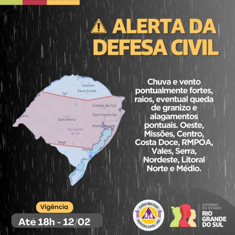 Conforme o órgão, deve haver chuva e vento fortes, com raios, queda de granizo, com possibilidade de alagamentos. O alerta abrange uma faixa que vai da Fronteira Oeste, passa por Missões, Campanha, Região Central, Vales, e chega à Costa Doce, Serra, Região Metropolita e Litorais Médio e Norte (Confira no mapa abaixo).