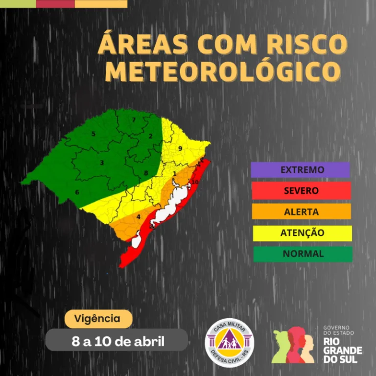 A Defesa Civil do Rio Grande do Sul publicou um alerta vermelho para chuvas intensas e risco de inundações em três regiões do Estado. O aviso, classificado como de nível severo, está vigente para áreas da Costa Doce, do Sul e para todo o Litoral gaúcho, diante da continuidade das condições meteorológicas adversas.