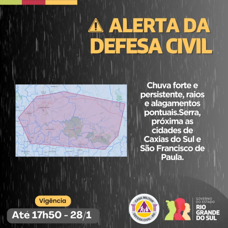Por fim, há um terceiro alerta que, além da chuva com raios, prevê alagamentos pontuais. Este aviso abrange áreas próximas a Caxias do Sul e São Francisco de Paula. O alerta vai até 17h50.