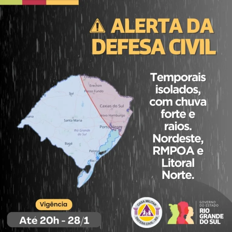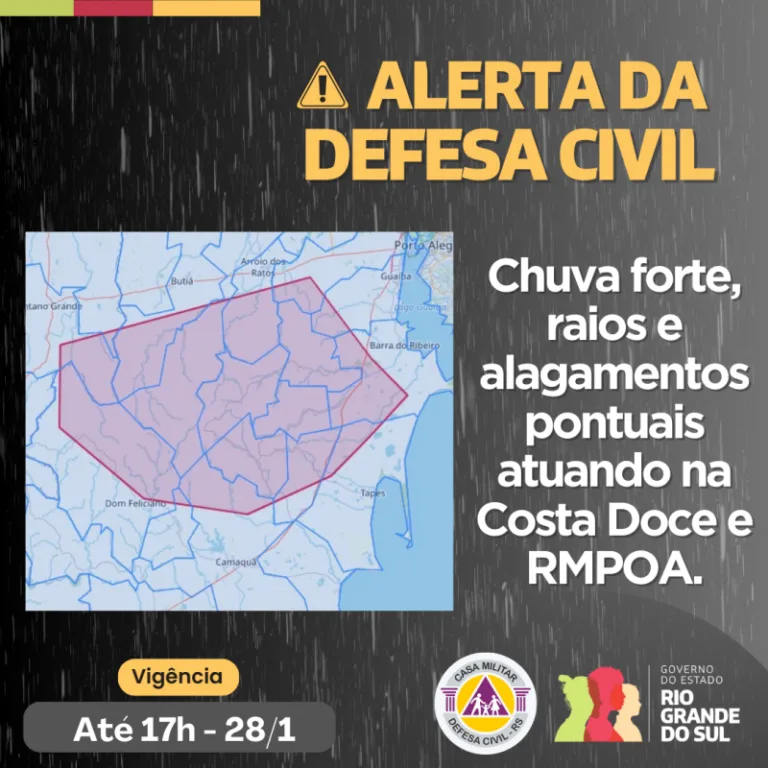 Além disso, há outro alerta para áreas da Região Metropolitana e na Costa Doce. O aviso se estende até às 17h e prevê chuva forte com raios.
