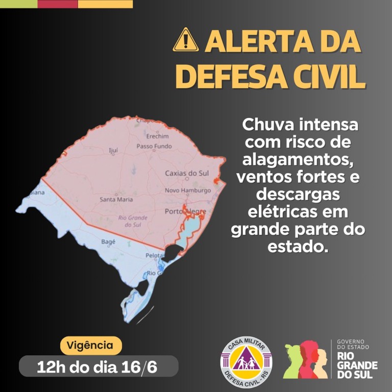 A Defesa Civil do Estado do Rio Grande do Sul renovou a advertência para o risco de chuvas e ventos fortes no RS. O alerta é válido até a manhã de domingo e abrenge quase todas as regiões gaúchas.