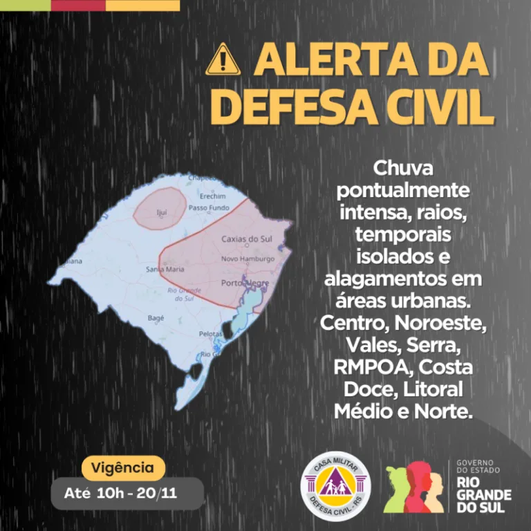 Deve ocorrer chuva na Região Central, na Costa Doce, Serra, Litoral, Região Metropolitana, Norte e Noroeste (Confira no mapa acima). Além de apontar as áreas de abrangência do alerta, a Defesa Civil repassa algumas orientações. Em caso de emergência, ligue 190 ou 193.