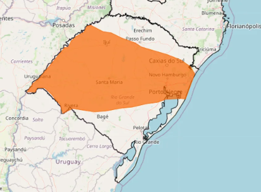 O alerta não abrange todo o território gaúcho. Esse alerta é válido para Fronteira Oeste, Noroeste, Norte, Região Central, Serra, Região Metropolitana, Vales e Litoral Norte (Confira no mapa abaixo).