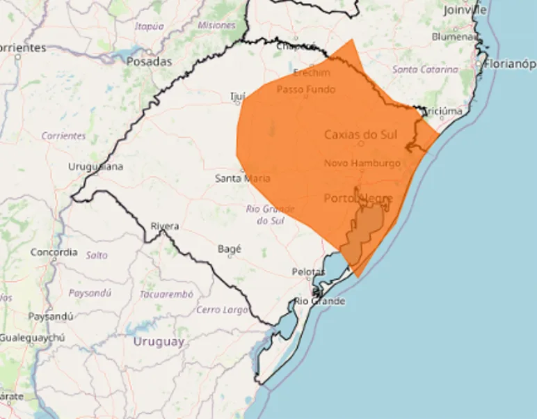 O alerta não abrange todo o território gaúcho que, neste sábado, tem também um alerta amarelo, de baixa intensidade, de chuvas intensas. Este alerta abrange a Costa Doce, Região Central, Litoral Norte, Região Metropolitana, Vales, Serra, Norte e Noroeste (Confira no mapa abaixo).