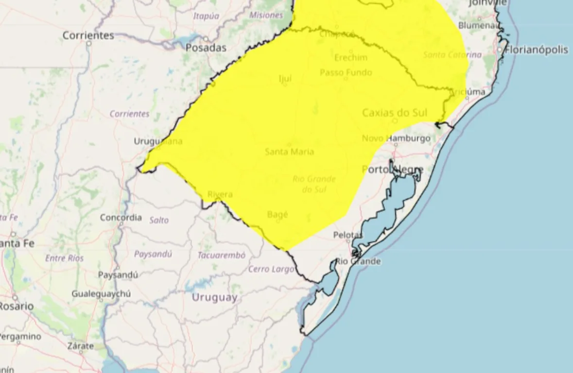 A advertência abrange a Fronteira Oeste, Campanha, Noroeste, Norte e região Central, além de parte da Serra gaúcha e das regiões do Vale do Taquari e do Vale do Rio Pardo.