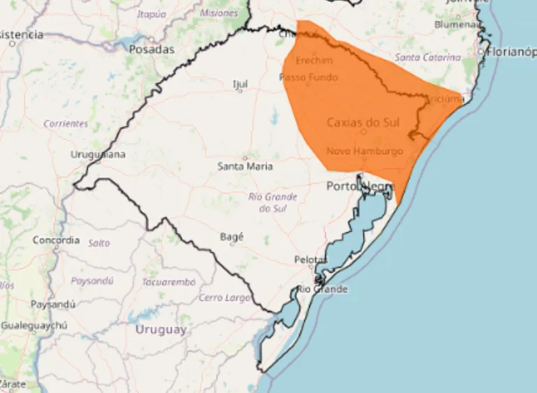 Conforme o Instituto, o alerta de maior intensidade é laranja, intermediário na escala do Inmet. Ele abrange praticamente toda a região Nordeste do território gaúcho (Confira no mapa abaixo). Este começa às 10h e vai até às 18h.