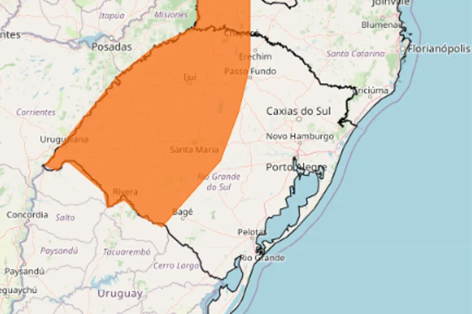 O alerta não abrange todo o território gaúcho. Deve chover na Fronteira Oeste, no Noroeste e parte do Norte, da Região Central, da Campanha e do Sul (veja no mapa abaixo).