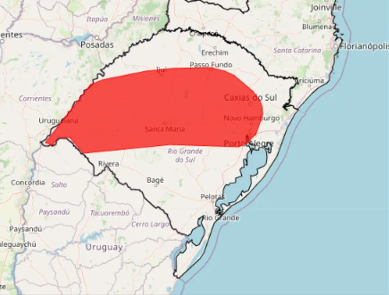 Este alerta é válido para uma faixa que vai desde a Fronteira Oeste, passa pelo Centro, Noroeste e Norte, e chega à Região Metropolitana e Serra (Confira no mapa abaixo). O alerta vermelho é o mais intenso nos parâmetros do Inmet, que também prevê fortes ventos costeiros.