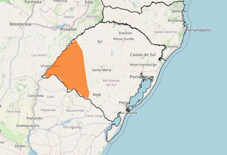O alerta laranja de tempestade, de grau perigo, vale até as 22h desta quarta e cobre a Fronteira Oeste e parte da Campanha gaúcha. Nessas áreas, conforme o aviso, a previsão é de chuva entre 30 e 60 milímetros por hora ou de 50 a 100 milímetros por dia, com ventos entre 60 e 100 km/h. Há risco de cortes de energia, destelhamentos, queda de árvores e alagamentos.