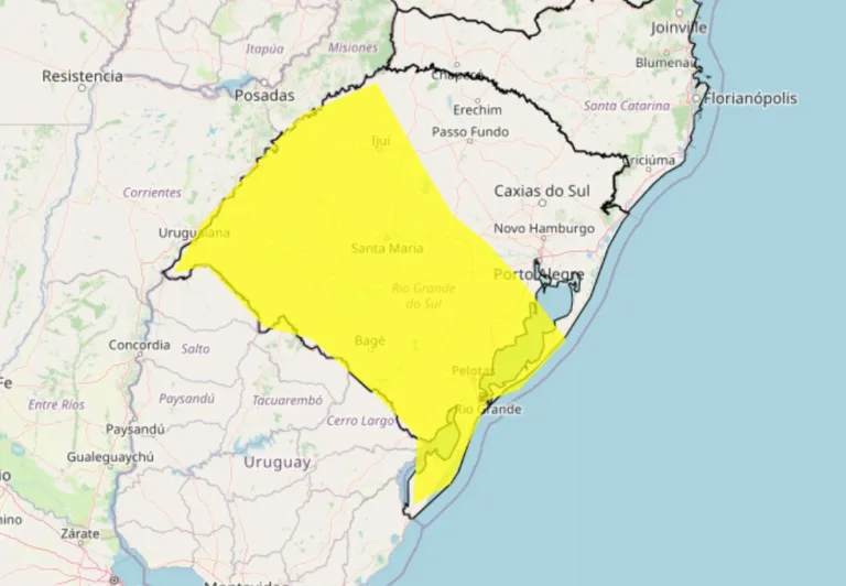 O segundo aviso, um alerta amarelo de tempestade, vai até as 5h de quinta-feira (8) e abrange a Fronteira Oeste, Centro, Campanha, região Sul, Costa Doce, parte do Noroeste e o Vale do Rio Pardo. Nestes locais, são esperadas chuvas de até 50 mm/dia, ventos de até 60 km/h e risco pontual de queda de granizo.
