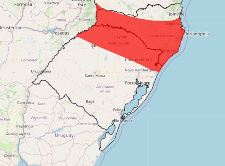 A faixa de municípios (veja detalhes abaixo) em perigo começa em Santo Cristo e passa por cidades como Santa Rosa, Panambi, Guaporé, Caxias do Sul, São Francisco de Paula e Terra de Areia no flanco sul do alerta. Todas as cidades que ficam mais próximas de Santa Catarina que as citadas acima têm risco elevado de chuva acima de 100 milímetros até o meio-dia de amanhã (3).