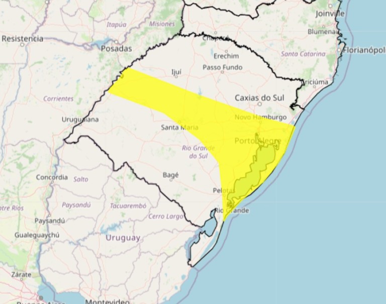 Para as regiões da Fronteira Oeste, Central, dos Vales, Costa Doce, região metropolitana, Litoral Médio e Litoral Sul, há um alerta amarelo. A previsão do Inmet é de chuvas intensas, mas em menor proporção do que foi registrado nos últimos dias.