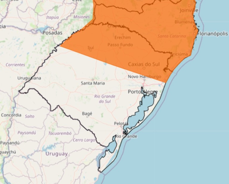 Conforme o Inmet, o maior risco é para as cidades do Noroeste, Norte, Serra e Litoral Norte gaúcho. Para essas regiões há um alerta vermelho de grandes acumulados de chuva.