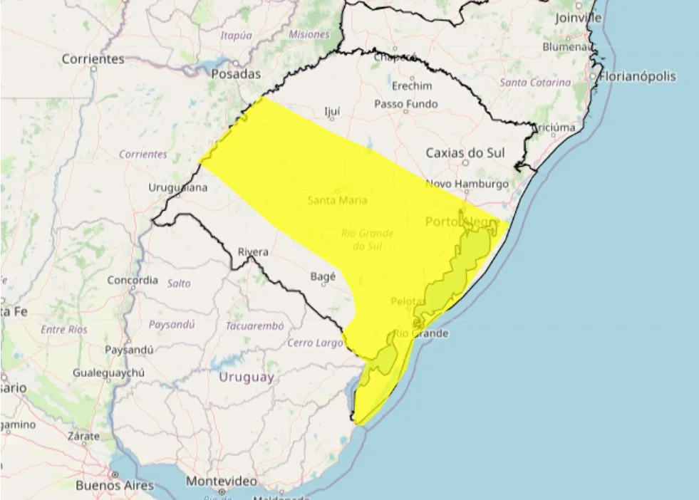 As áreas em risco incluem parte da Fronteira Oeste, parte da Campanha, região Central, Costa Doce, Litoral Médio, Sul do RS, região dos Vales, região metropolitana e parte do Litoral Norte.
