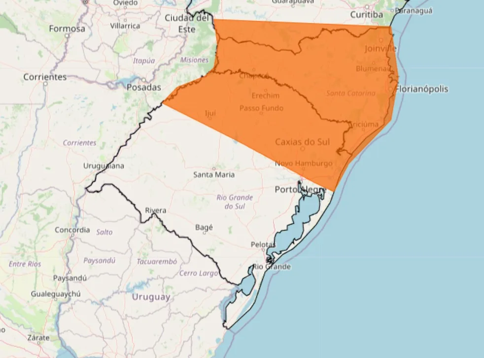 As áreas em risco incluem parte da Fronteira Oeste, parte da Campanha, região Central, Costa Doce, Litoral Médio, Sul do RS, região dos Vales, região metropolitana e parte do Litoral Norte.