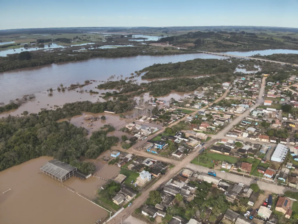 O município de Cristal, que fica a 44km de São Lourenço do Sul, é a única cidade que já tem Decreto de Situação de Emergência no sistema da Defesa Civil. Imagem aérea mostra o nível da água na cidade.