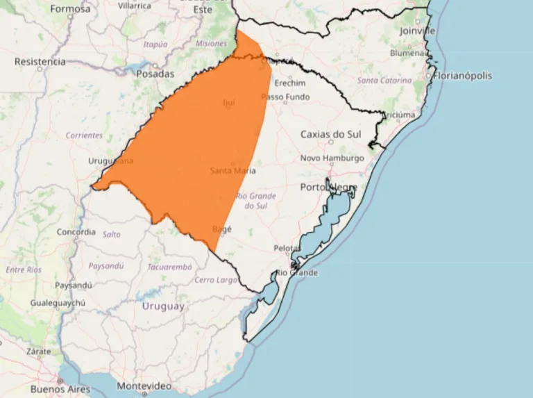 Para a região da Fronteira Oeste, Noroeste e parte das regiões da Campanha, Norte e Central do RS, há um alerta laranja de tempestade. O Inmet adverte para a possibilidade de temporais, com chuva intensa, com até 100 mm acumulados; ventos fortes, com rajadas de 60 a 100 km/h; e até queda de granizo.