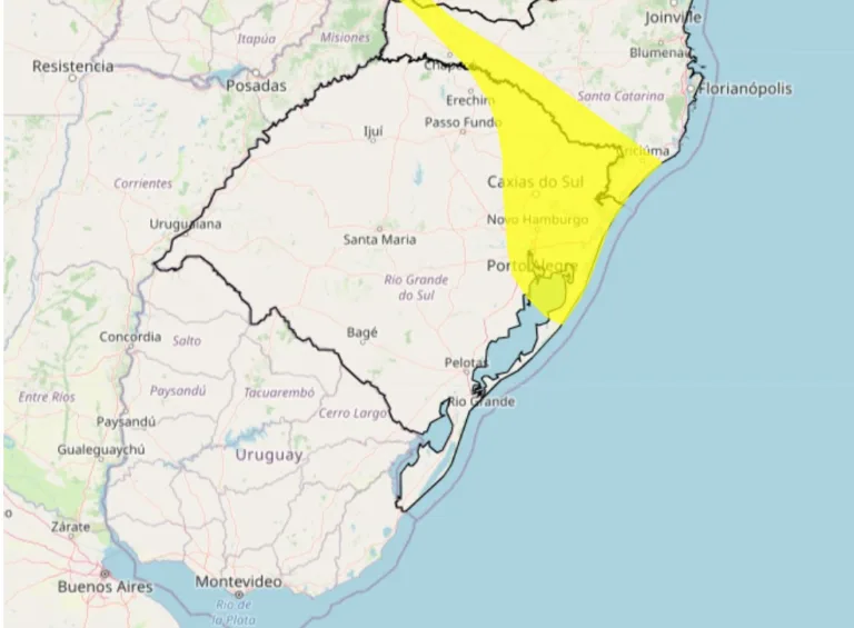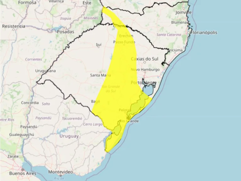 Por fim, na faixa entre a região metropolitana, Litoral Norte, Serra e região dos Vales, há um alerta amarelo de tempestade. Ele também aponta risco de temporais nessas regiões. As instabilidades, porém, devem atuar a partir da madrugada, com chuva intensa e ventos fortes. O alerta é válido entre meia-noite e meio dia desta terça-feira (15).