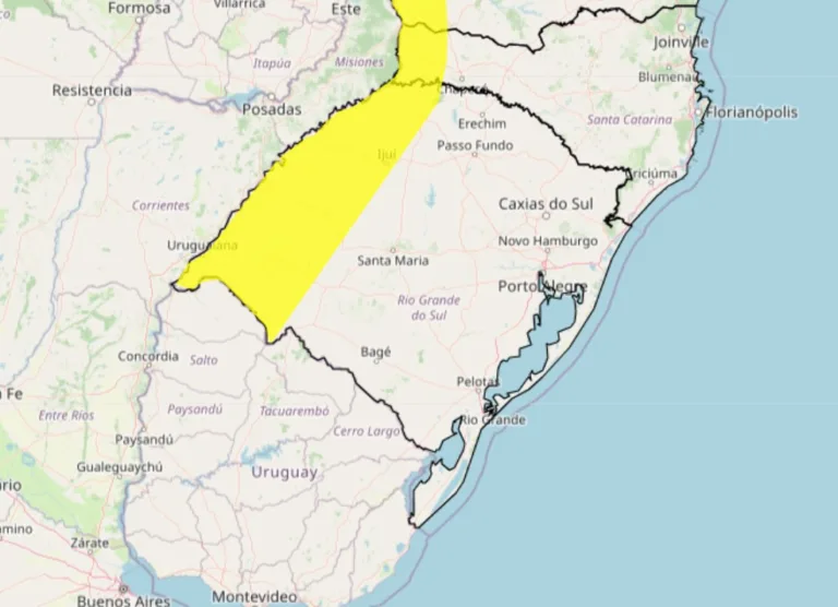 O Inmet (Instituto Nacional de Meteorologia) publicou um alerta amarelo de tempestade nesta quinta-feira (17). A advertência abrange áreas do Oeste do Rio Grande do Sul.