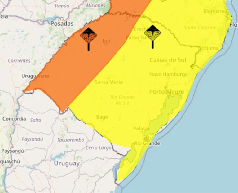 Em paralelo, um segundo aviso, classificado como de “perigo potencial”, estende a área de atenção para praticamente todo o território gaúcho. Estão incluídas a região da Campanha, Costa Doce, Sul, Litoral Norte, região dos Vales, Metropolitana e Serra Gaúcha. Nessas áreas, a previsão é de acumulados de até 50 milímetros, ventos de até 60 km/h e queda de granizo em pontos isolados.