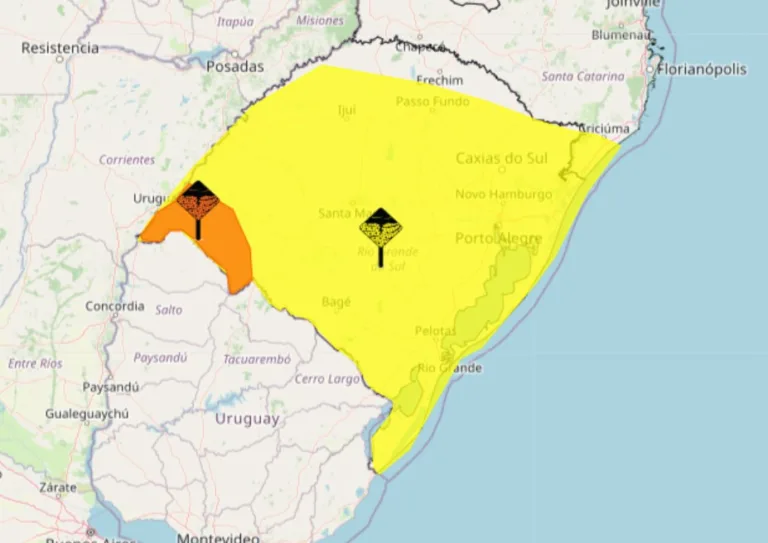 Nas outras regiões gaúchas, há um alerta amarelo de tempestade. Ou seja, também há risco de chuvas intensas e rajadas de vento, mas os volumes acumulados chegam até os 50 mm e a ventania será menos intensa (40-60 km/h).