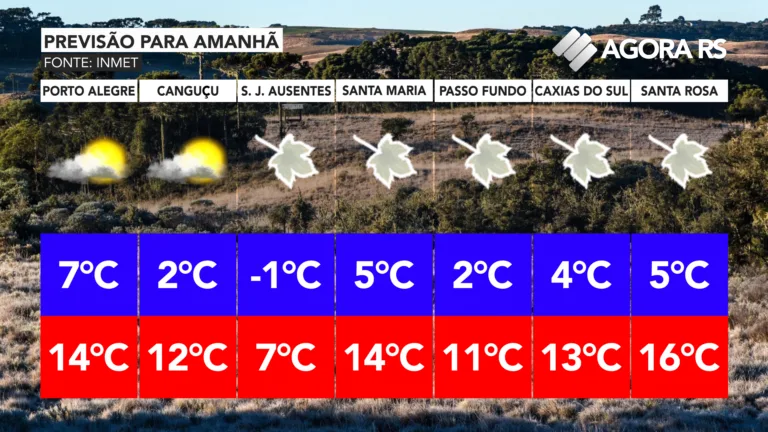 Conforme a secretaria, as temperaturas variam entre 1 e 6°C sobre o Estado, chegando aos 0°C na Serra. Além disso, há condições de chuviscos e neve em áreas altas da Serra gaúcha na madrugada e começo da manhã. No Oeste, faixa Leste e Norte, também há chance de eventuais chuviscos.