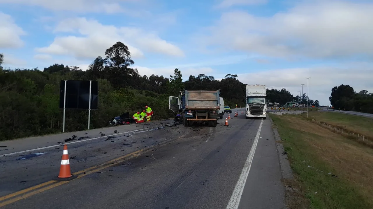 De acordo com a Polícia Rodoviária Federal, a batida foi do tipo colisão frontal e envolveu uma caçamba, emplacada em Porto Alegre, e um automóvel Nissan Sentra, com placas de Canoas.