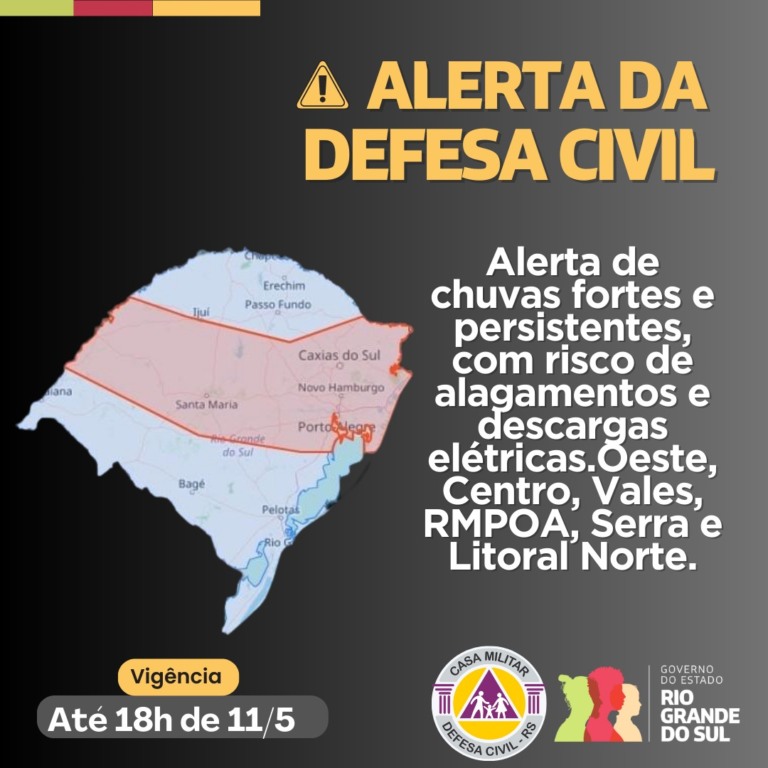 A Defesa Civil do Estado do Rio Grande do Sul publicou um alerta para a possibilidade de chuvas intensas, com risco de alagamentos e descargas elétricas. As condições meteorológicas adversas devem ocorrer até as 18h deste sábado (11).