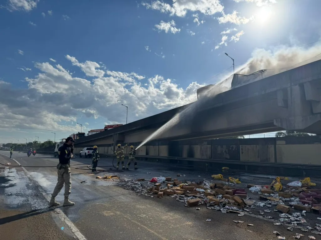 O veículo de carga tombou pegou fogo e o condutor morreu carbonizado. Parte dos produtos transportados, que seriam rações para animais domésticos, caiu na pista e foi saqueado.