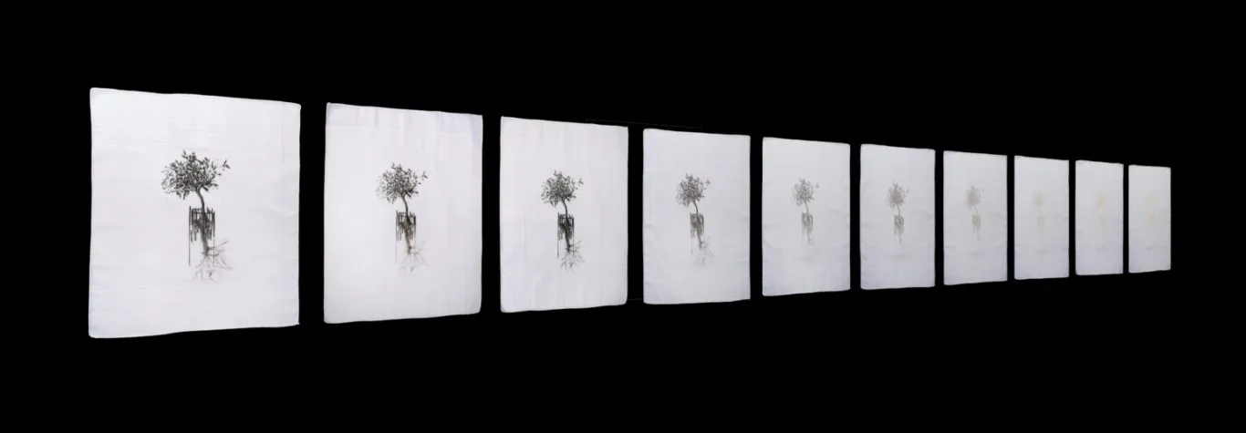 A mostra reúne uma série de litografias impressas em lenços e guardanapos, muitos deles pertencentes a familiares da artista. “Vinculados ao universo feminino por seu caráter doméstico, esses tecidos leves e delicados fornecem interessantes contrastes ao encontrar, de um lado a pedra calcária, matriz litográfica, e de outro as imagens fortes produzidas por Miriam”, pontua o curador da exposição, Paulo Gomes.