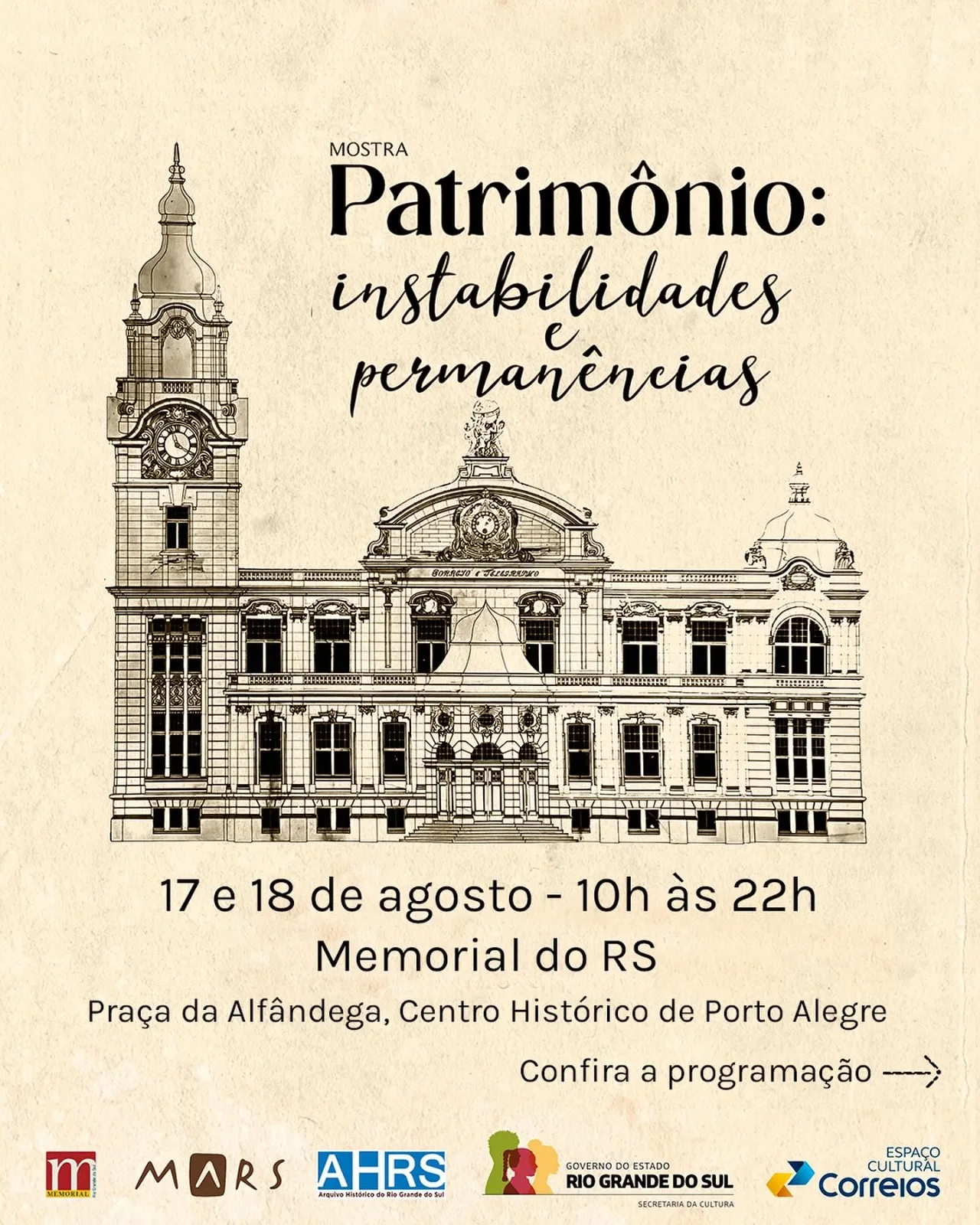 Também neste sábado, um pouco mais cedo às 10h, será inaugurada a mostra “Patrimônio: instabilidades e permanências”. A mostra propõe uma reflexão sobre a preservação do patrimônio cultural após vivenciarmos uma crise climática em maio deste ano. Além da exposição haverá oficinas e atividades educativas que acontecem neste sábado e domingo.
