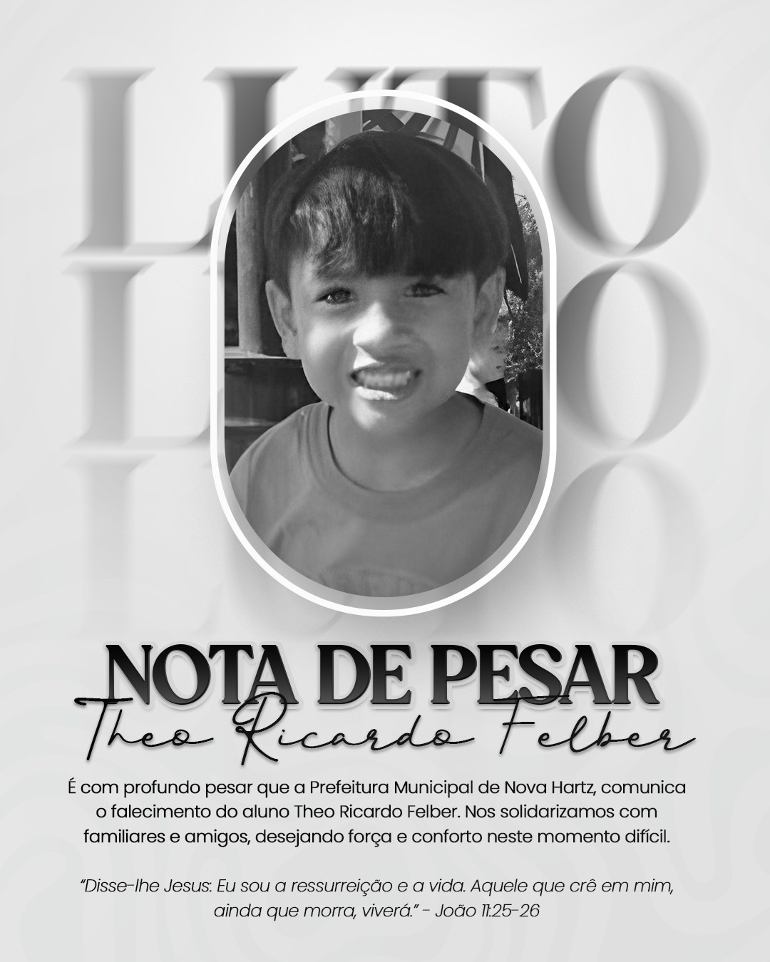 A Prefeitura de Nova Hartz manifesta seu profundo pesar pelo falecimento de Theo Ricardo Felber, aluno da EMEF Imigrante. Aos familiares e amigos, desejamos força nesse momento de dor e luto.