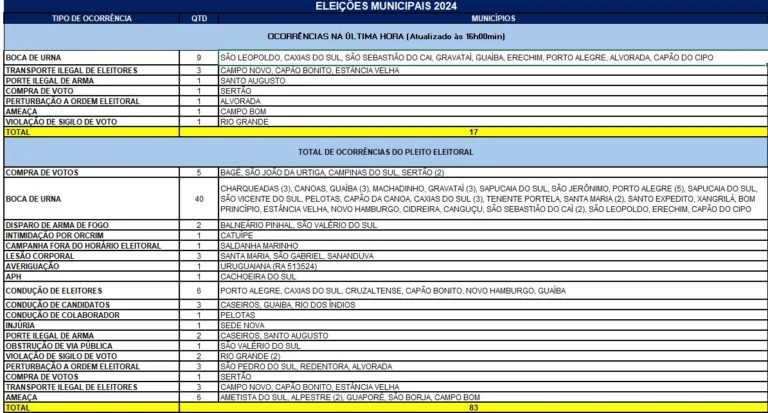 A SSP (Secretaria de Segurança Pública do Rio Grande do Sul) está divulgando, neste domingo (6) de eleições, a relação de ocorrências registradas no Estado durante o pleito. Neste momento, são 83 ocorrências.