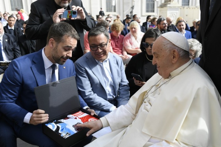Na conversa com o Papa, Leite presenteou Francisco com uma escultura das ruínas de São Miguel das Missões, além de camisas do Grêmio, Internacional e Brasil de Pelotas. “Foi uma conversa muito gentil, muito amável, do Papa conosco. Ele agradeceu pelos presentes e pelo convite e também lembrou que ele já esteve muitas vezes na cidade de Pelotas, onde um tio dele morou”, relatou o governador.