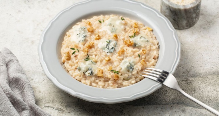 Retire a panela do fogo e adicione o queijo e 1 colher de sopa de manteiga. Ajuste o sal (cuidado pois o gorgonzola é um queijo salgado). Mexa até que o risoto fique cremoso. Sirva quente, decorado com salsinha fresca picada, se desejar.