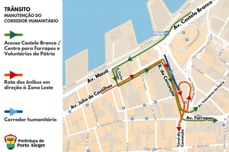 Além disso, com a permanência do corredor humanitário, o acesso à avenida Farrapos se dará pela avenida Mauá, à esquerda na rua Carlos Chagas. Em seguida, deve-se ir pela avenida Júlio de Castilhos e rua da Conceição. A partir daí, o condutor pode seguir para Voluntários da Pátria ou Farrapos.